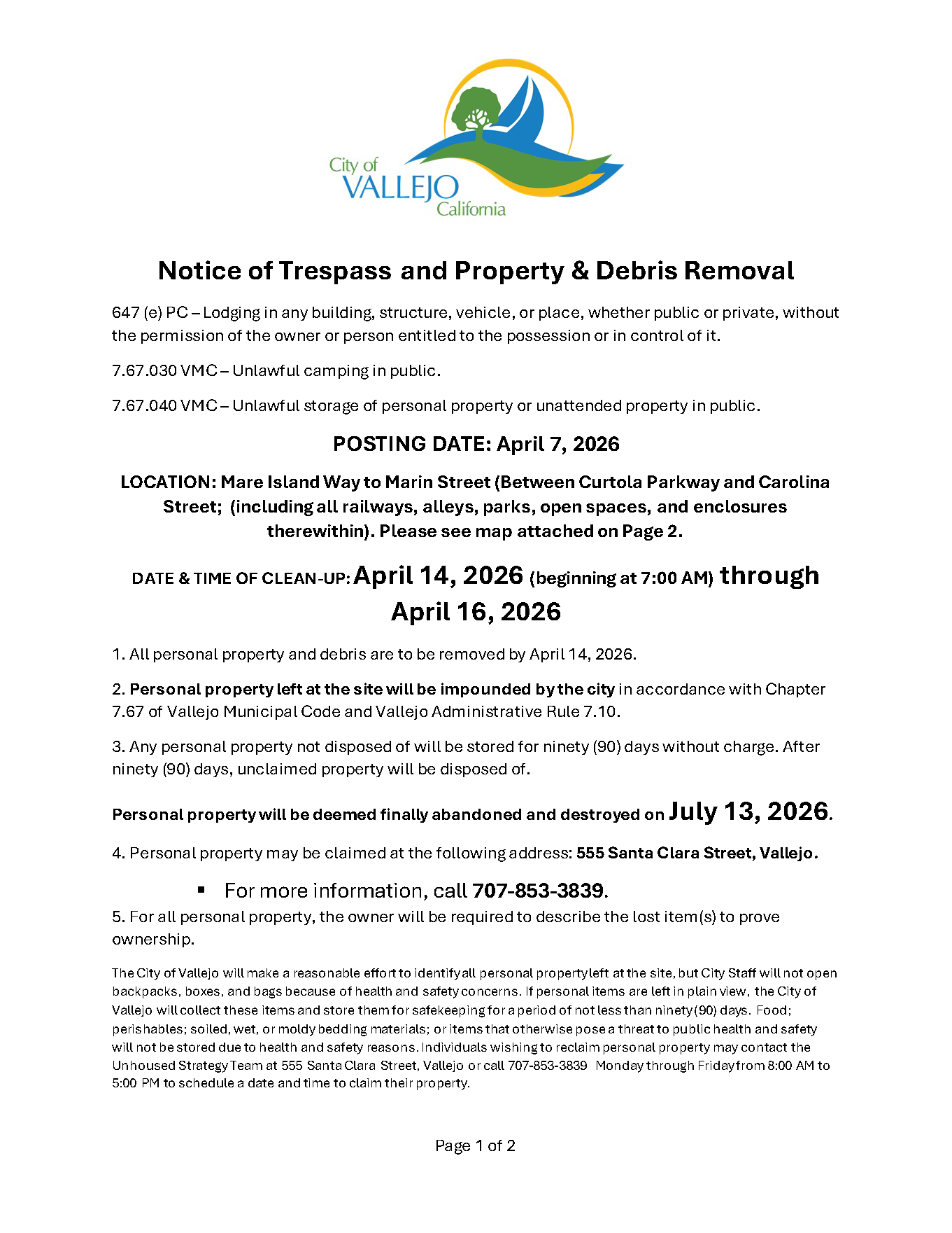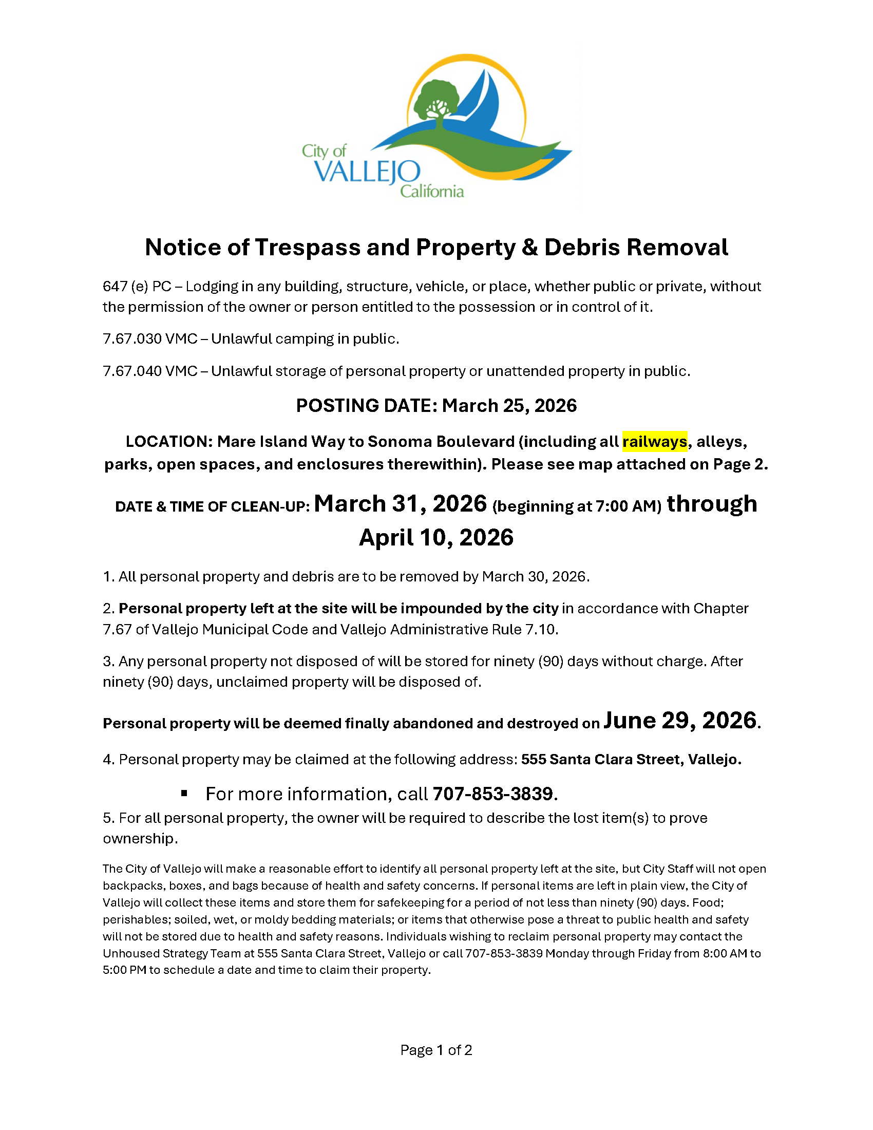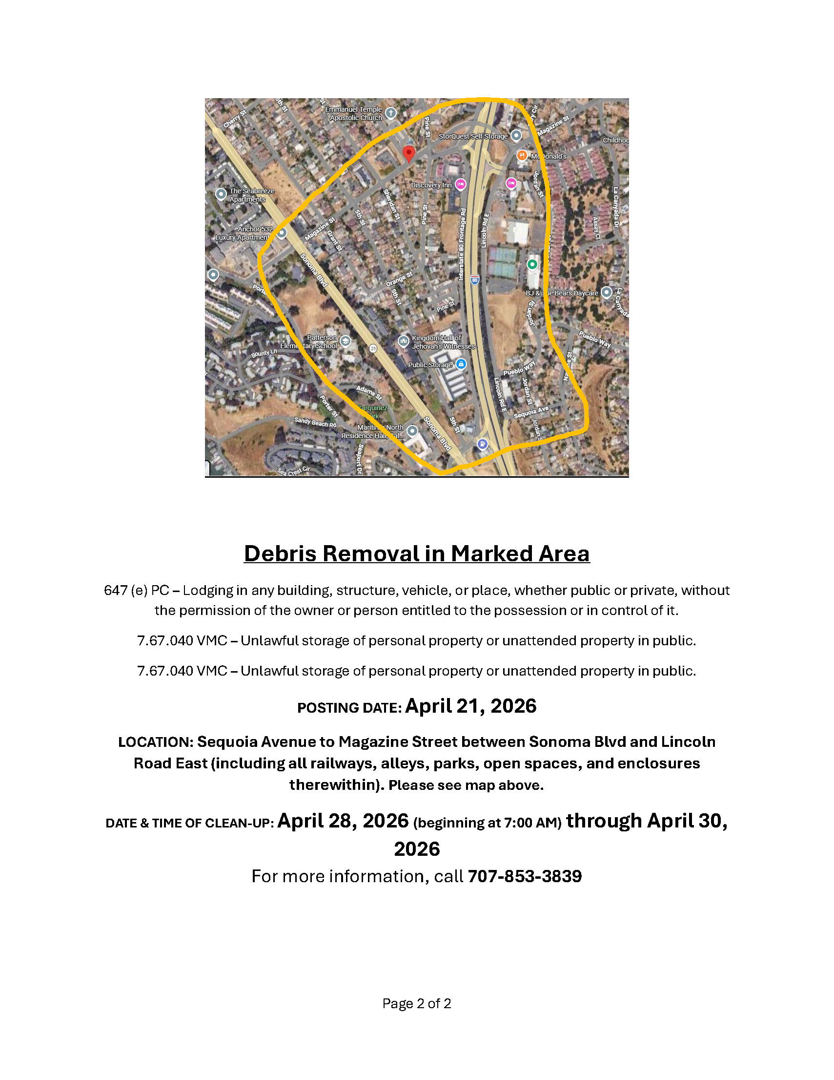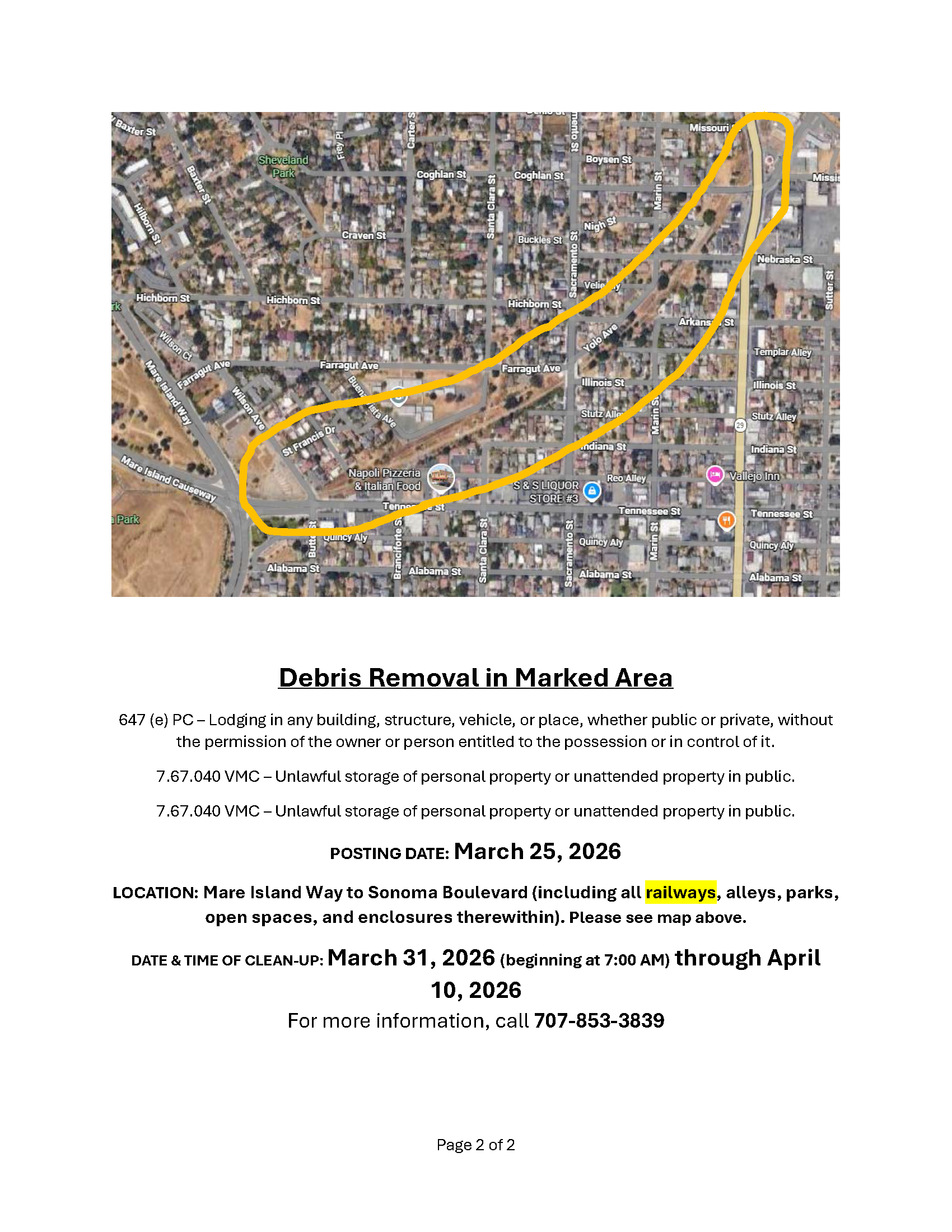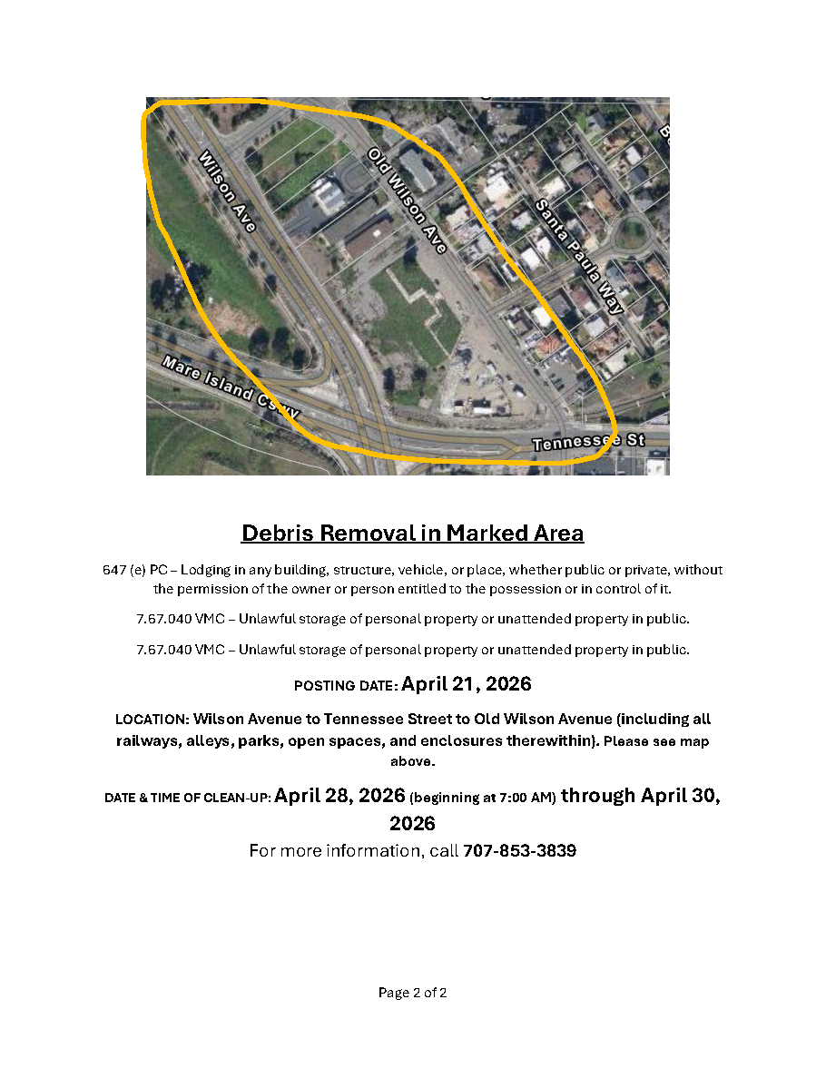 Notice of Trespass and Property & Debris Removal - Lemon Street to Magazine Street between Sonoma Blvd and Highway 80