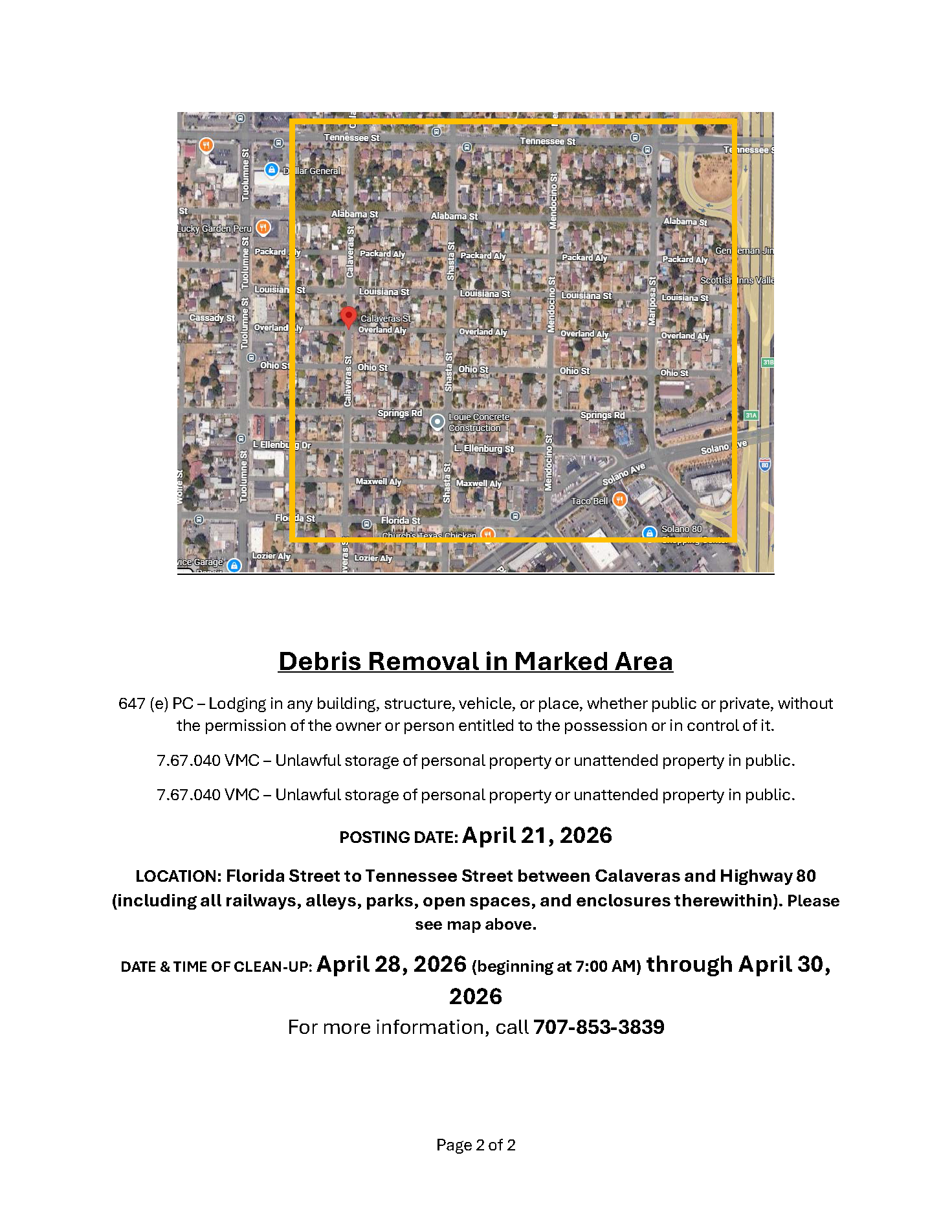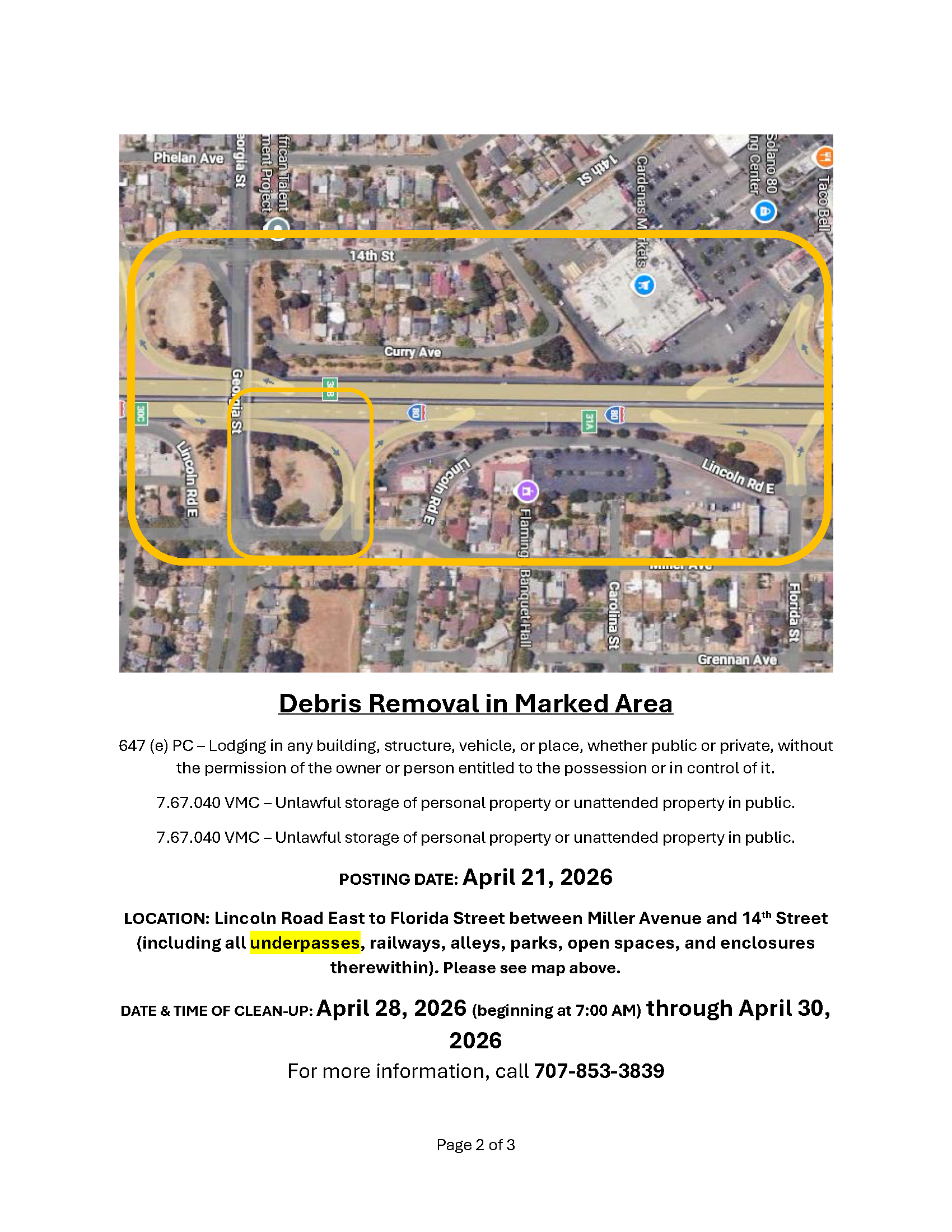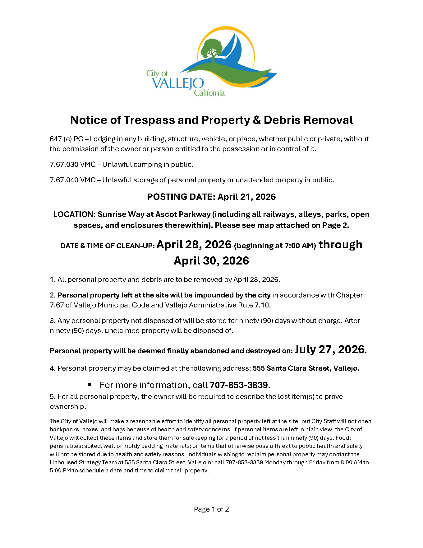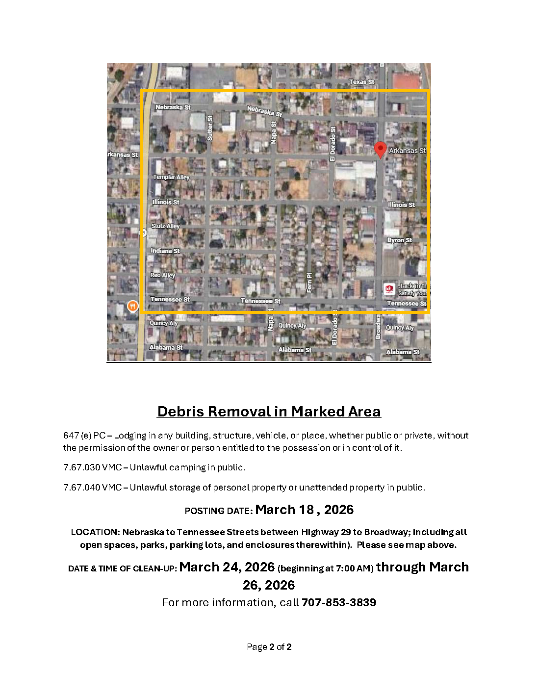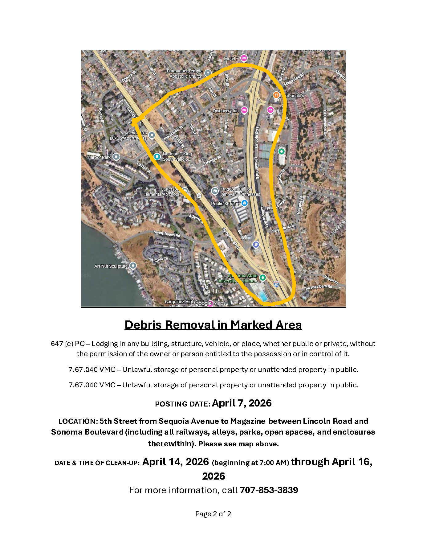 Notice of Trespass and Property & Debris Removal - Lemon Street to Magazine Street between Sonoma Blvd and Highway 80