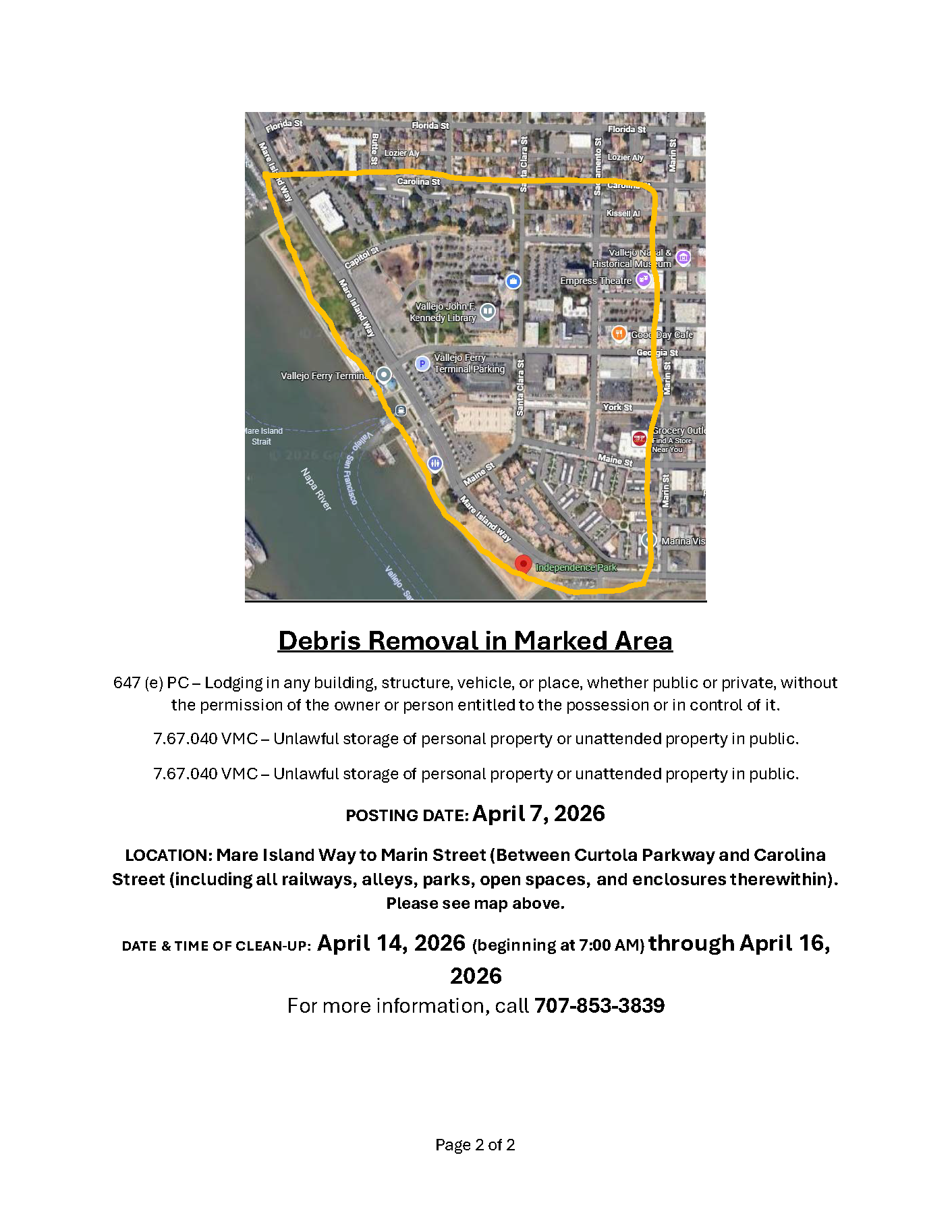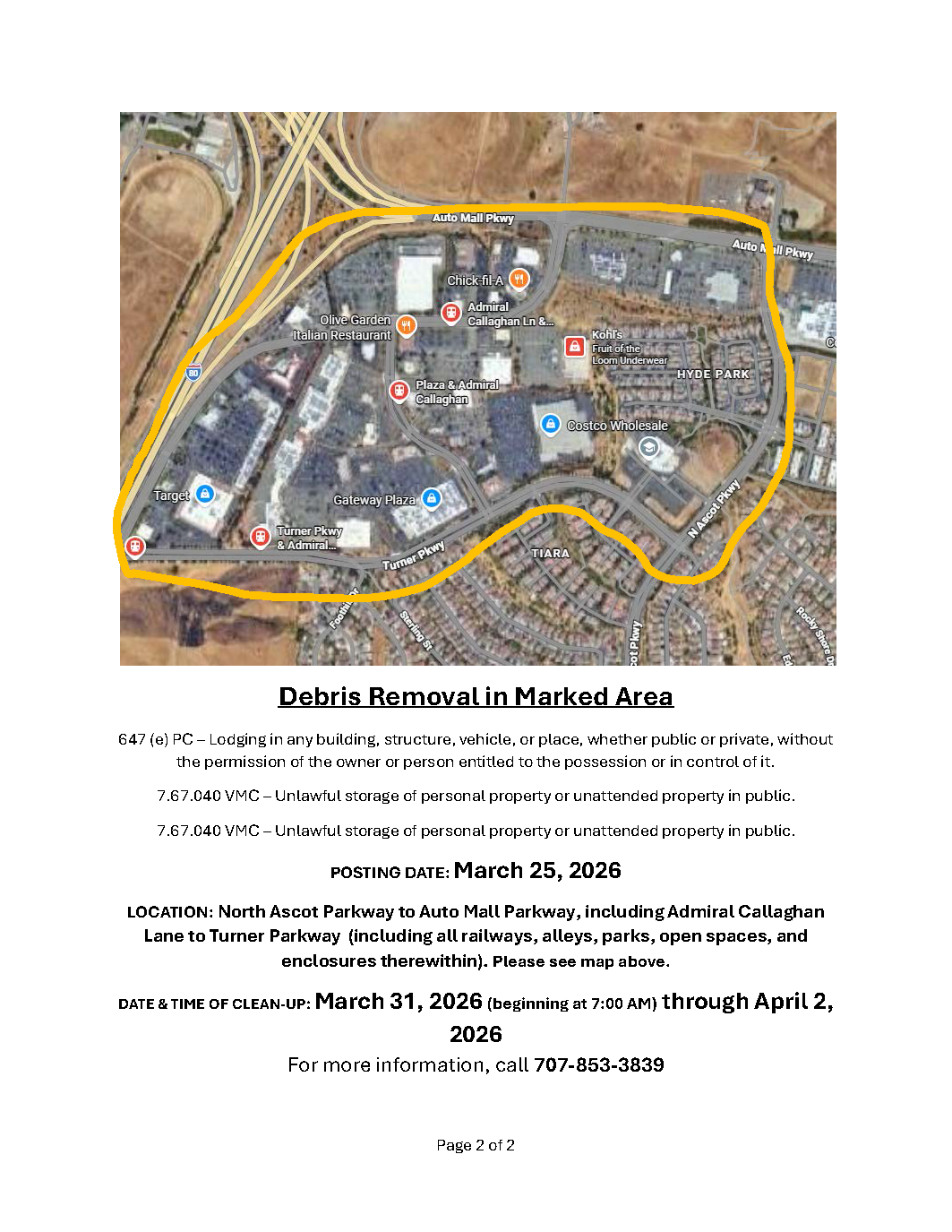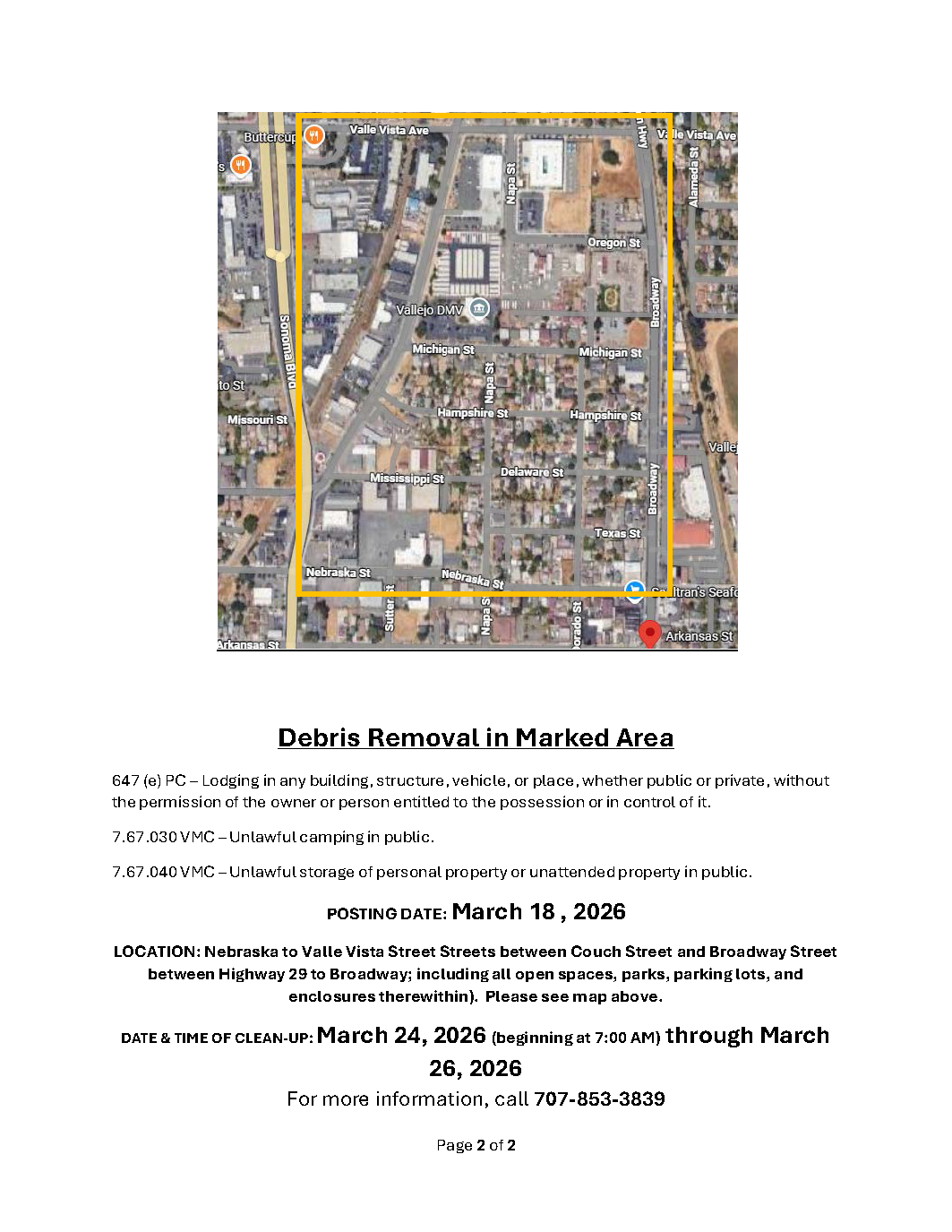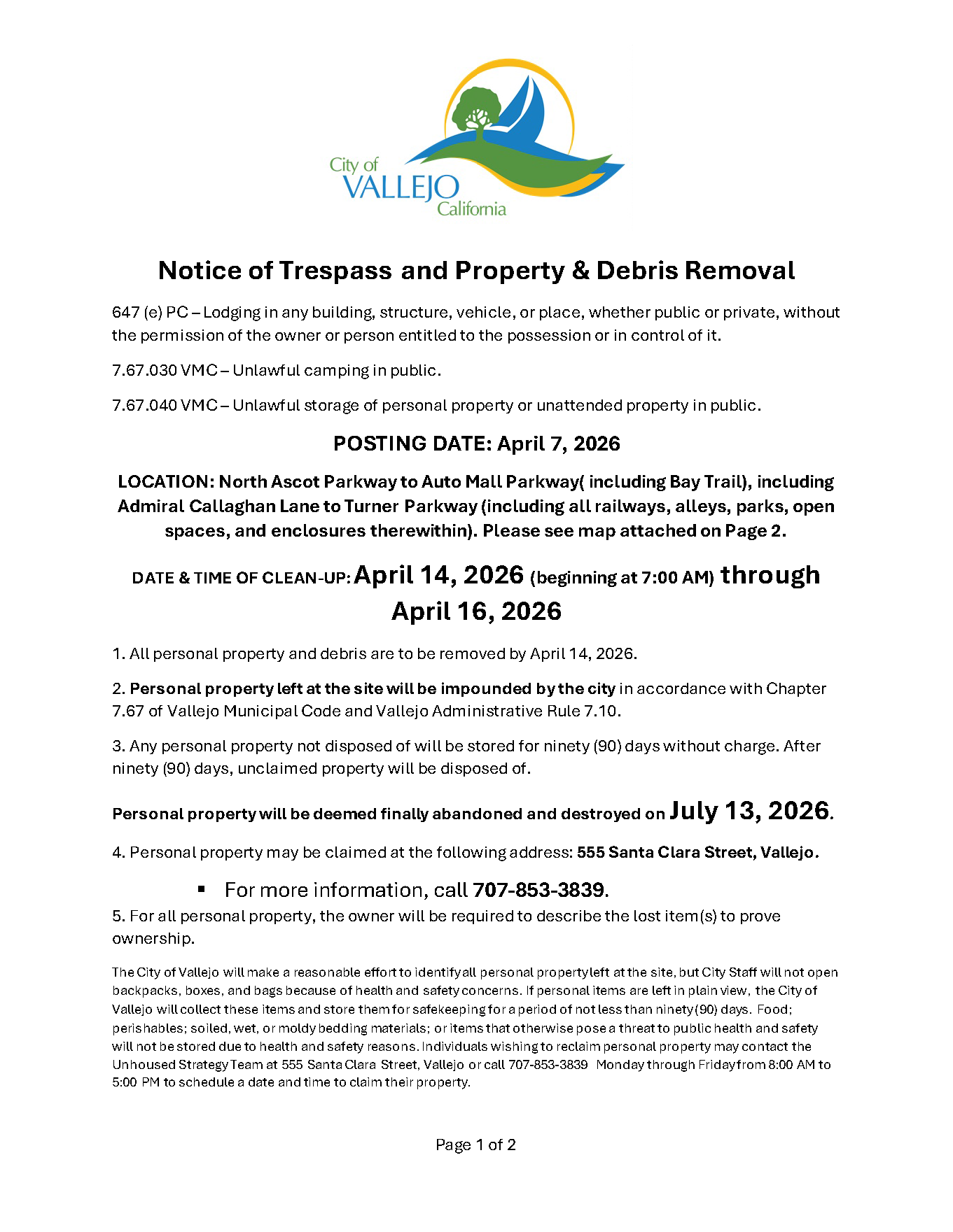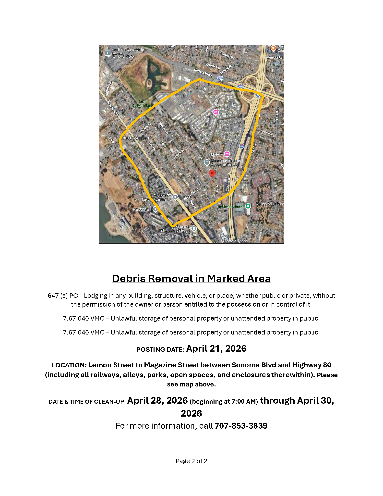Notice of Trespass and Property & Debris Removal - Lemon Street to Magazine Street between Sonoma Blvd and Highway 80