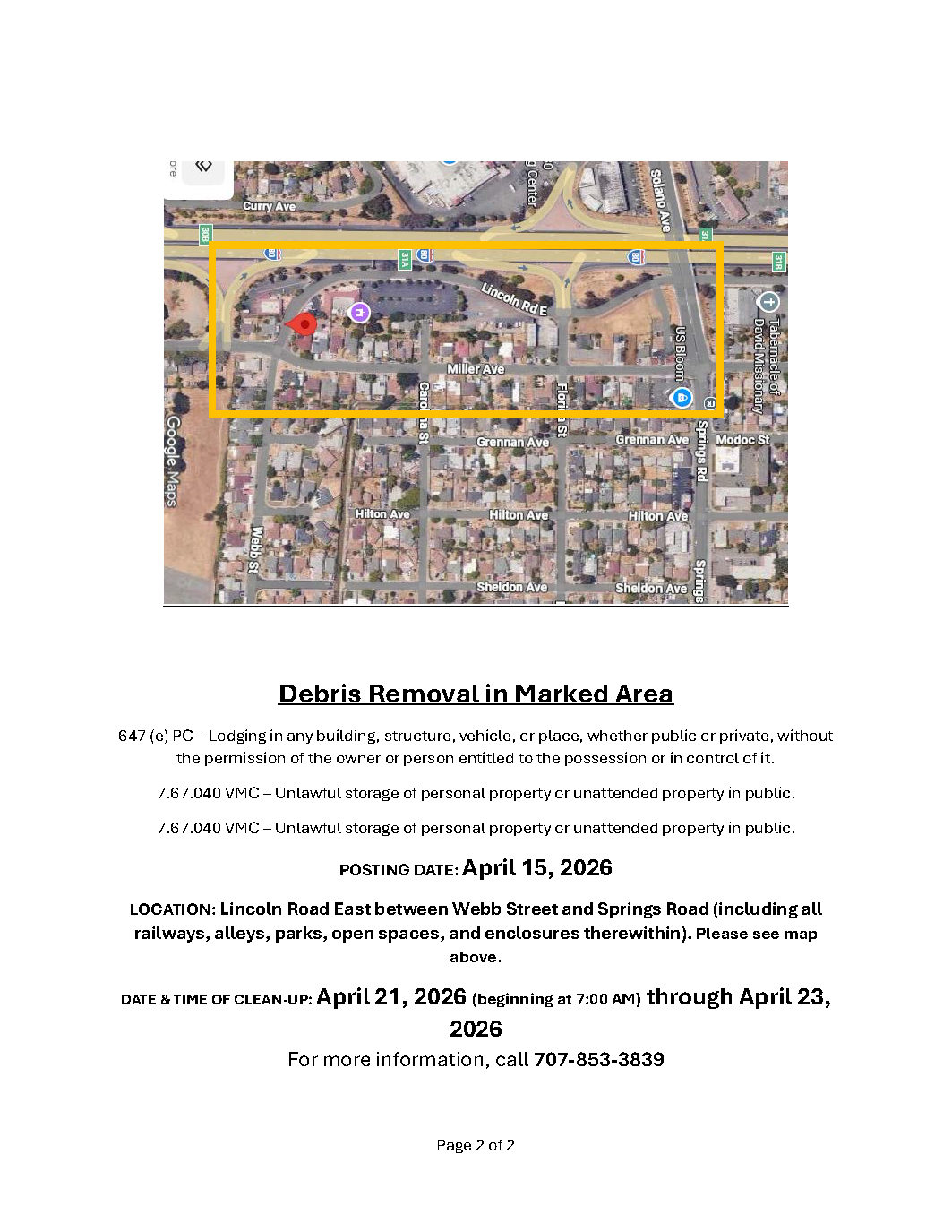 Notice of Trespass and Property & Debris Removal - Lincoln Road between Webb and Springs